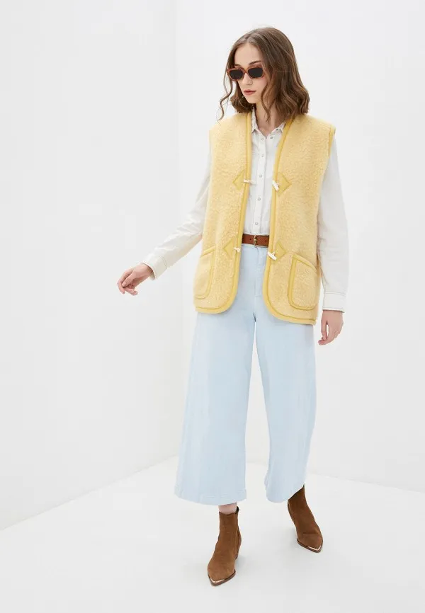 Меховой жилет просто создан для теплых зимних комплектов. Актуальный в 2021 году желтый красиво разбавит сезонную капсулу нейтральной расцветки.