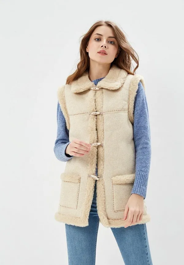 Жилет из овчины идеально вписывается в повседневный стиль и хорошо защищает от холодов. Стилизуй с меховой безрукавкой нескучные винтажные комплекты, сочетая с джинсами клеш и блузами с пышными рукавами.