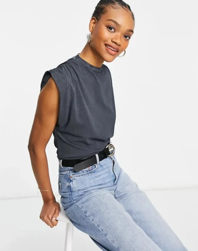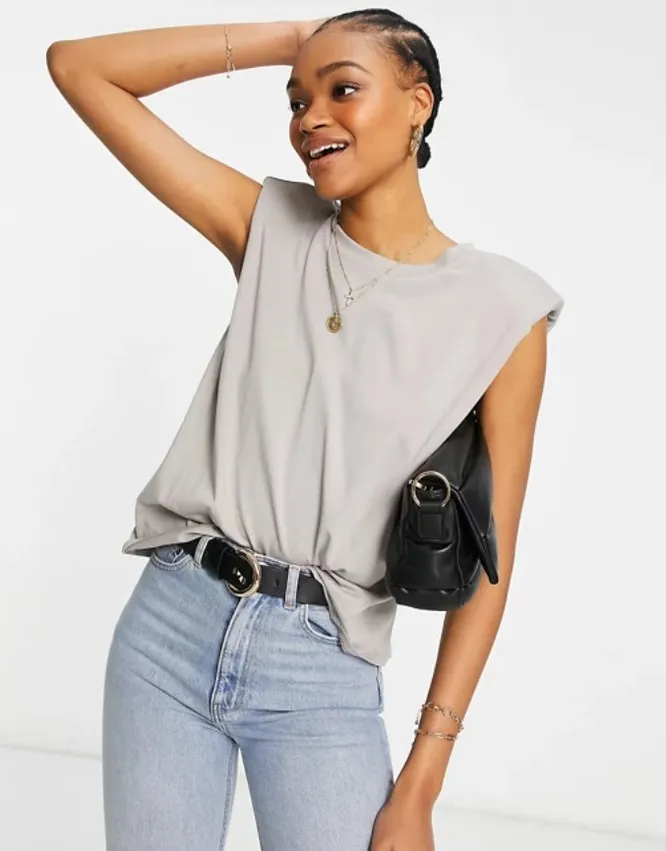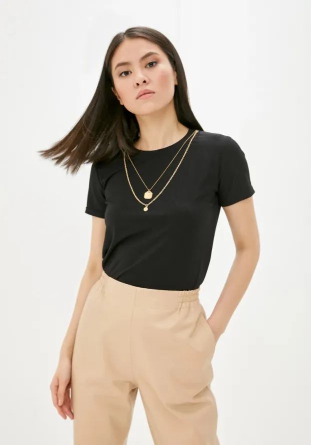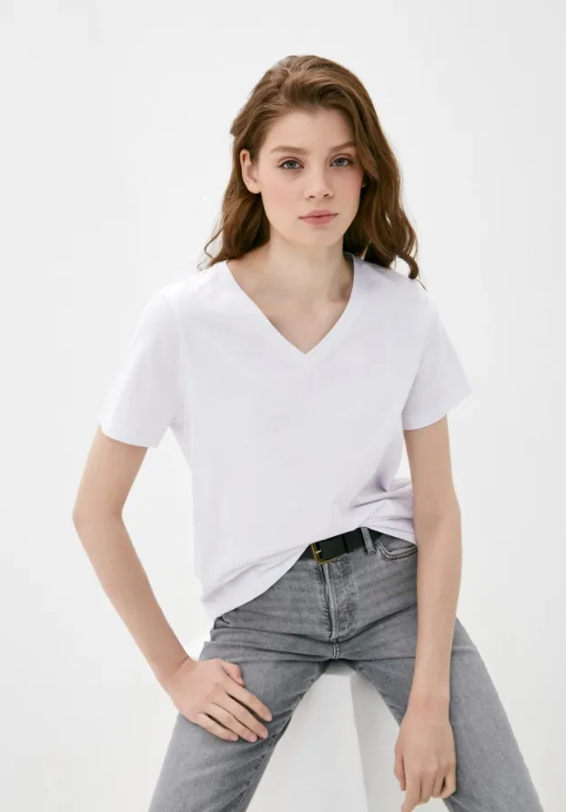 Если хочешь визуально удлинить шею, выбирай футболки с V-образным вырезом. Для деловых образов идеально подойдут модели с воротником-стойкой. По-прежнему актуальны футболки без рукавов со сборками на плечах или подплечниками.