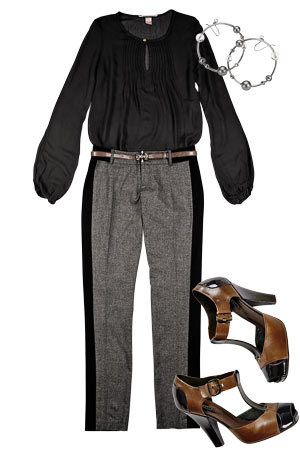 | Шляпа, Celine; туфли, Santoni | Ремешок, Naf Naf, Сумка, Henry Beguelin Балетки, Baldinini Trend |