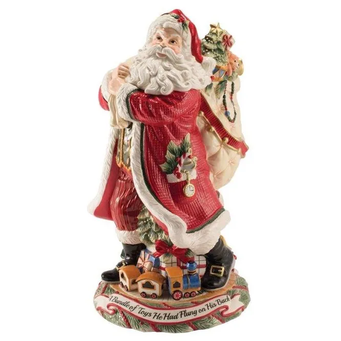 Эта фигурка идеально дополнит новогодний интерьер и особенно красиво будет смотреться под нарядно убранной елкой. Она изображает Деда Мороза с огромным мешком подарков. Он одет в классический, отороченный белым мехом красный кафтан, из кармана которого выглядывают золотые часы на цепочке, символизирующее канун Нового года. Украшение изготовлено из качественной керамики, покрыто яркими красками и прозрачной стеклянной глазурью. Все мельчайшие детали четко прорисованы, имеют реалистичные оттенки. Фигурка придется по душе как детям, так и взрослым, а также может стать оригинальным подарком для родственников или близких друзей.
