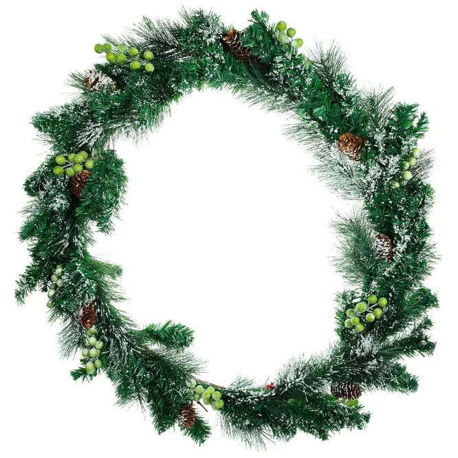 Красивая пушистая гирлянда шириной 35 см и длиной 180 см, способна привнести в любое помещение атмосферу уюта, умиротворенности и предвкушения наступления Нового года. Гирлянду можно разместить на любой вертикальной или горизонтальной поверхности, но наиболее удачно она будет смотреться в качестве арочного обрамления дверного проема. Еловые веточки изготовлены из мягкого ПВХ, имеют природный оттенок и на первый взгляд совершенно неотличимы от настоящих ветвей. Они изысканно переплетаются, хаотично чередуя темные изумрудные и ярко-зеленые оттенки. Дополнительно гирлянда украшена еловыми шишками, маленькими листиками и красными ягодами.