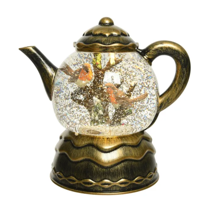 Декоративная композиция изготовлена из пластика, который имитирует стекло и бронзу и представляет собой нарядный чайник, внутри которого расположены фигурки снегирей в зимнем оперении, сидящие на ветках дерева. Прозрачная емкость, являющаяся оригинальной разновидностью классического новогоднего шара, заполнена водой, в которой плавают сотни перламутровых блесток. Под определенным углом они кажутся сверкающим снегом, который окутывает птиц. Благодаря широкому основанию и шару с водой композиция очень устойчива. Ее можно как разместить под нарядно убранной елкой, так и поставить на любую горизонтальную поверхность в качестве новогоднего украшения.