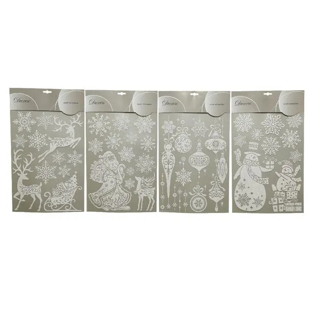 Этот набор включает разные по размеру и содержанию белоснежные наклейки, которые можно размещать на окнах, предметах мебели, дверях и стенах. Изображенные фигурки соответствуют классической новогодней тематике, имеют изящную, очень тонко вырезанную форму с обилием мелких декоративных деталей. Они включают Деда Мороза, оленей, снеговиков, елочные шары и разнообразные снежинки. Утонченные линии напоминают, особенно издалека, настоящий морозный узор на окнах. Наклейки изготовлены из влагостойкого винила, украшены блестками, имеют самоклеющуюся поверхность, которая надежно прилипает к стеклу, а после удаления не оставляет следов.