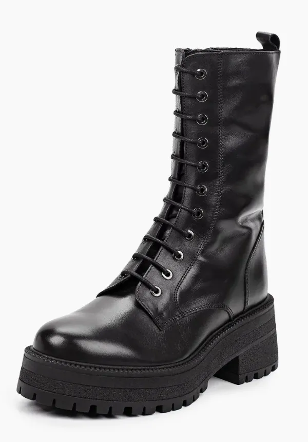 Модная альтернатива классическим зимним сапогам – черные женские ботинки на шнуровке и толстой подошве. Для создания эффектного дерзкого образа дополняй их узкими кожаными брюками или виниловыми легинсами, полупрозрачной блузой и кожаным бралеттом. Также можно поиграть а контрастах и дополнить достаточно грубой обувью нежное платье, летящую юбку или струящиеся брюки палаццо.