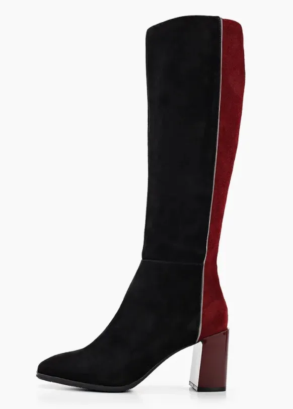 Добавить остроты повседневным образам помогут замшевые черно-красные сапоги на устойчивом блочном каблуке. Особенно круто они смотрятся в составе монохромных образов. Предлагаем носить биколорные сапоги с черными колготками и шифоновыми платьями длины миди или попробовать надеть их с шортами-бермудами в деловом стиле и оверсайз-пиджаком.