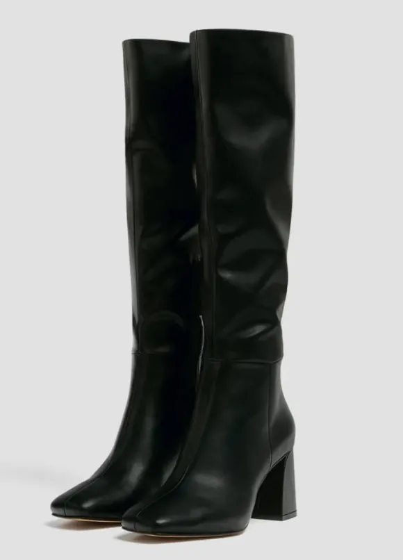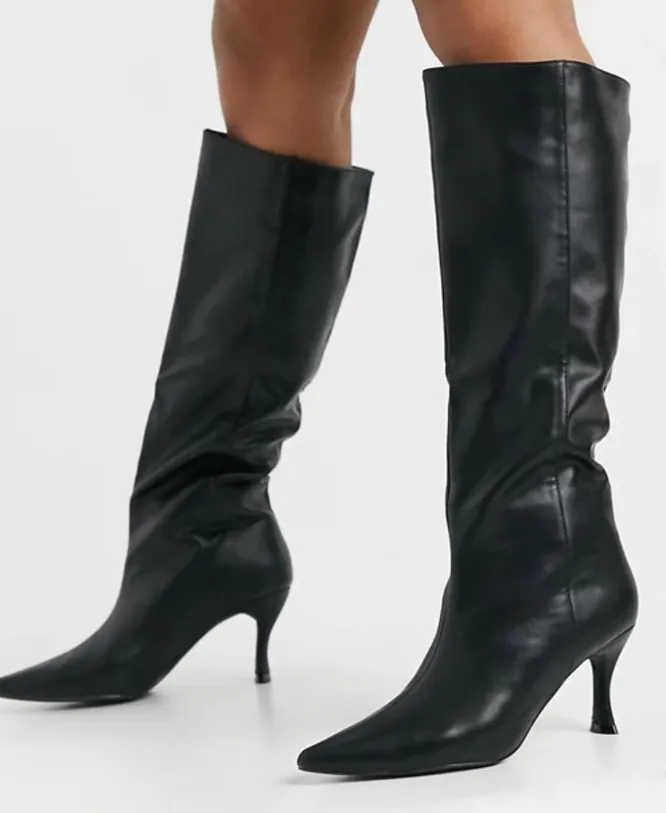 Если ты в поисках новой модели черных сапог, то обрати внимание на эту пару. Острый нос, ультрамодный каблук, шов спереди – эти детали не только делают сапоги стильными и универсальными, но и помогут визуально удлинить ноги и сделать их стройнее. Широкое голенище позволяет носить их не только с юбками и платьями, но и с джинсами и брюками прямого или зауженного кроя. Бери пример с модных блогеров и сочетай сапоги с брюками-бананами и объемными свитером или с кожаной мини-юбкой и строгим пиджаком в мужском стиле.