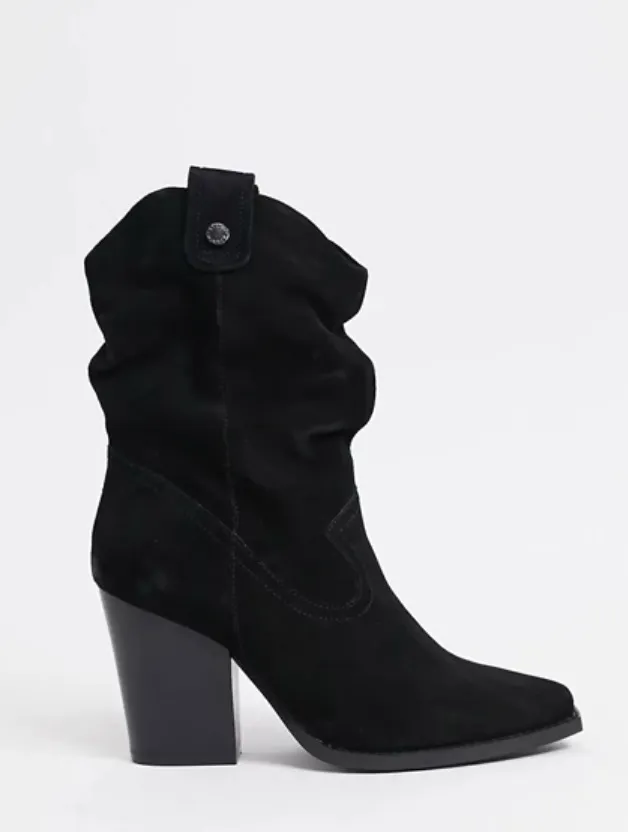 Черные сапоги до колена в ковбойском стиле можно обыгрывать разными способами. Например, они гармонично смотрятся с платьями в стиле бохо и кожаными куртками – так можно пойти хоть на вечеринку, хоть на прогулку в парк. Чтобы собрать лук в стиле вестерн, комбинируй сапоги-казаки черного цвета с прямыми синими джинсами, замшевой или фланелевой рубашкой и сумкой-почтальонкой. Если хочешь получить дерзкий лук, носи их с кожаными брюками-бананами, кроп-топом и пиджаком мужского покроя.