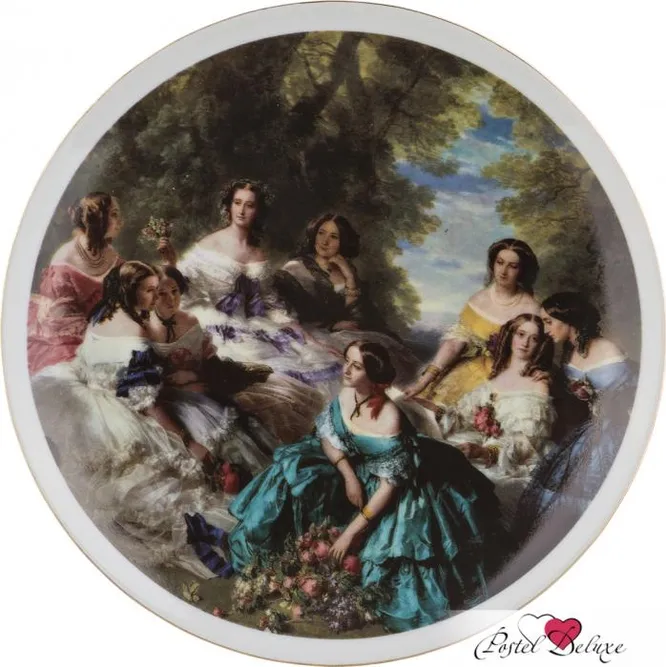 Изысканная фарфоровая тарелка способна украсить не только кухню, но и гостиную, прихожую, кабинет. Стилистически она сочетается с массивной мебелью, книжными шкафами и тяжелыми портьерами. На ней изображена полноценная репродукция в духе реалистичных портретов и пейзажей XIX века. В центре сюжета – молодые дамы в нарядных платьях середины того же столетия. Умиротворенная обстановка и густые кроны деревьев на заднем фоне говорят о прогулке в саду, тем более что на переднем плане присутствует охапка распустившихся цветов, прорисованных в мельчайших подробностях.