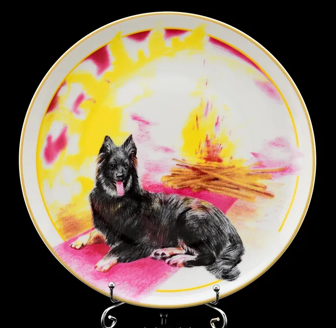 Фарфоровая тарелка представляет собой предмет из коллекции, которая включает четыре разных изображения собак на фоне природных явлений. Оформление этих тарелок принадлежит авторству известной современной российской художницы Нелли Петровой. Четыре изображения призваны символизировать четыре главные стихии: огонь, воду, землю и воздух. На фоне символичного изображения стихий присутствуют собаки разных пород, как олицетворение ближайшего друга человека. Данная тарелка, изображающая отдыхающего пушистого пса на фоне костра, отсылает именно к стихии огня. Спокойствие животного и ровное пламя привносят в помещение атмосферу умиротворенности.