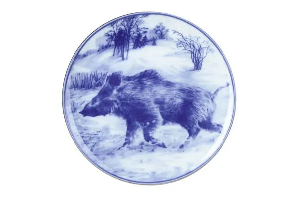 Основой сюжета этой картины является использование значения, которое вкладывается в китайский иероглиф, изображающий кабана. Согласно трактовке, он обозначает как бурлящую жизненную силу, так и удачу, процветание. Таким образом, кабан символизирует гармонию двух начал, необходимых для благополучной жизни. Автором этого реалистичного изображения, нанесенного на фарфоровую тарелку, является Нелли Петрова, для которой характерно обращение к животным мотивам. Двухцветный рисунок, выполненный в монохромной манере краской чернильного оттенка, показывает лесное животное в естественной среде обитания зимой.