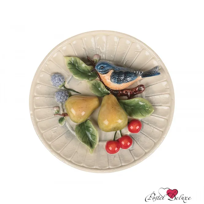 Это настенное украшение представляет собой полноценную картину, включающую элементы натюрморта и сидящую рядом реалистично выполненную маленькую птицу. Тарелка содержит объемное, трехмерное изображение с мельчайшим образом прорисованными деталями. Она изготовлена из керамики и покрыта очень плотным слоем глазури. Благодаря ей краски застрахованы от случайного стирания и выгорания со временем. Кроме этого, такой плотный глазурованный слой, в котором изображение практически утопает, характерен для некоторых ретро-статуэток, настенных и настольных аксессуаров. Поэтому тарелка может быть дополнением не только кухонного, но и жилого интерьера.