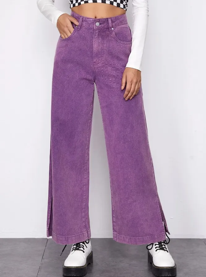 Если хочешь выделиться из толпы и вызвать «вау-эффект» — купи широкие пурпурные джинсы. Предлагаем носить их с лавандовым свитером или жилетом поверх белой рубашки. С ними также хорошо смотрятся минималистичные вещи спокойного цвета, например серый жакет и бежевая футболка.