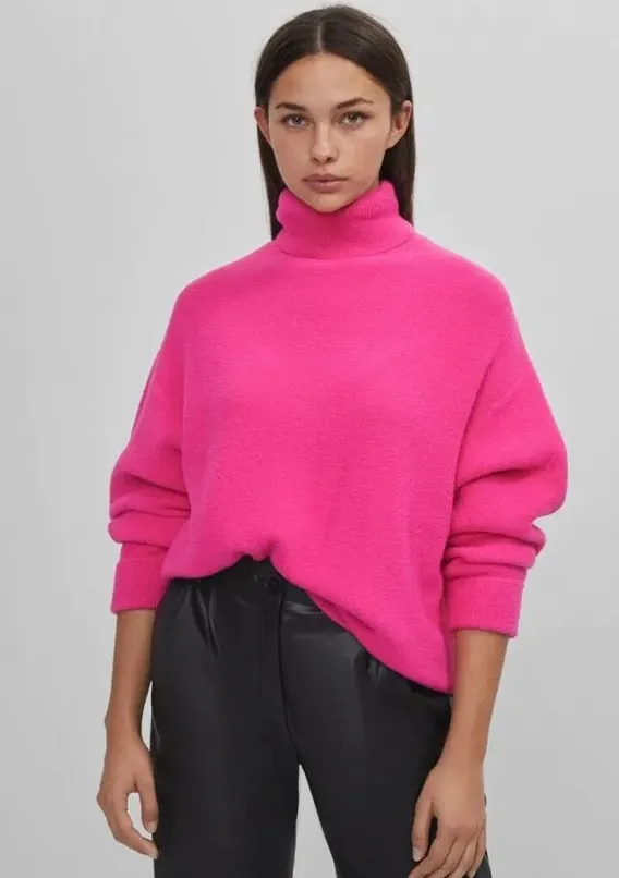 Этот розовый свитер, несмотря на свой яркий цвет, органично впишется в разные образы. С его помощью можно поставить акцентное пятно в монохромном ансамбле или собрать лук в стиле колор-блок. Во втором случае предлагаем надеть его с изумрудными брюками и завершить комплект синей сумкой и белой обувью.