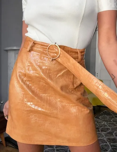 Кожаная юбка сейчас есть у каждой первой модницы, советуем и тебе не отставать. Удачной покупкой станет лаконичная, но в то же время акцентная юбка песочного цвета с тиснением под кожу крокодила, с ней ты составишь много образов для любого повода. В офисе она уместна с плотными колготками, строгой рубашкой и удлиненным блейзером. За его пределами носи ее с водолазкой и объемным свитером, а если предстоит вечеринка – дополняй блестящими колготками и воздушной полупрозрачной блузкой.