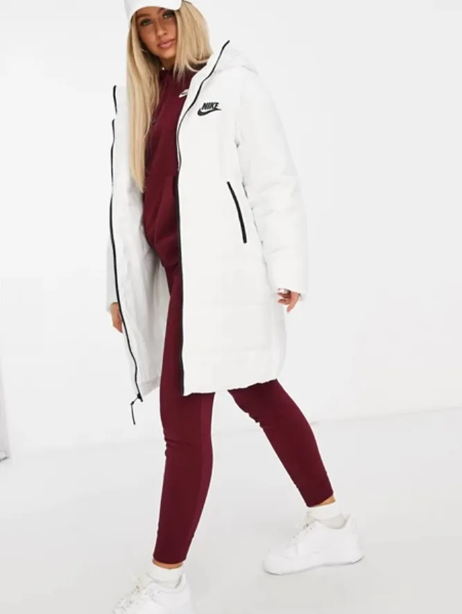 Длинный белый пуховик идеально подойдет для многослойных, расслабленных повседневных луков. Можно носить его с широкими трикотажными брюками, массивными зимними кроссовками и оверсайз-шарфом. Под низ надевай худи или теплый свитер, пиджак в сочетании с водолазкой и вязаным жилетом или плотную рубашку свободного кроя. Если собираешься за город, надевай пуховик с треккинговыми ботинками, шапкой-ушанкой, варежками и утепленными джоггерами или дутыми штанами.