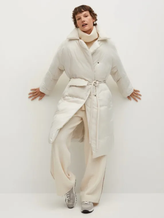 Длинный женский белый пуховик свободного кроя с поясом – модная альтернатива пальто оверсайз. Он гармонично смотрится как с базовыми повседневными вещами, так и с более элегантными комплектами. Ты можешь носить его с летящими платьями и сапогами на каблуке или с грубыми ботинками и джинсами, если хочешь получить модный лук на каждый день. Чтобы сделать акцент на талии, замени пояс на контрастный ремень.