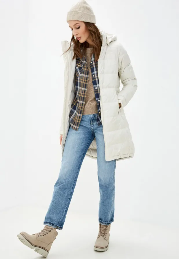 Комфортный стеганый пуховик с натуральным наполнителем – удачный выбор для городской среды. Модель легко комбинируется как с базовыми, так и с более яркими трендовыми вещами и аксессуарами. Предлагаем попробовать собрать образ, используя бежевый цвет, – такой ансамбль смотрится дорого, стильно и подходит к любому случаю.