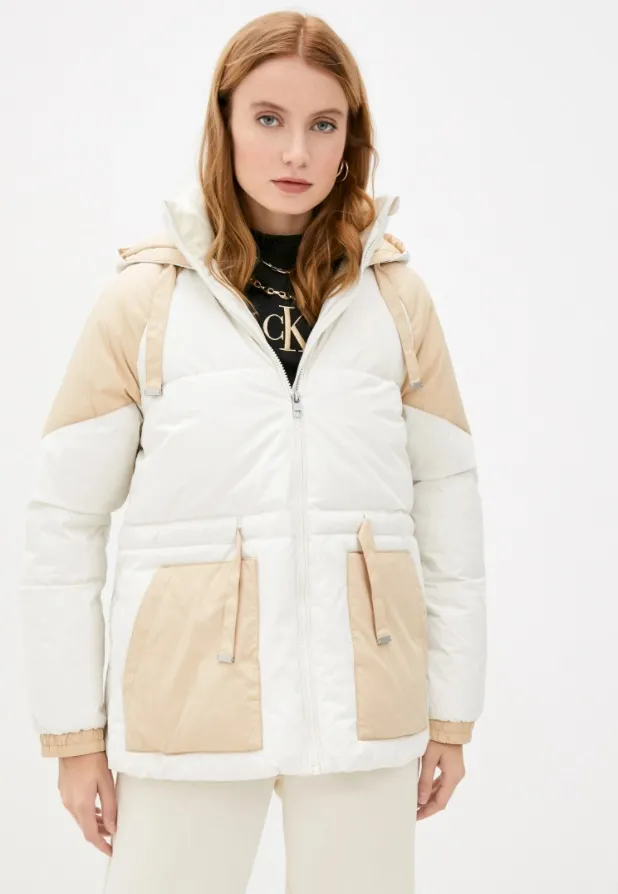 Еще один трендовый вариант – зимний белый пуховик с контрастными вставками нейтрального бежевого цвета. Модель отлично впишется как в расслабленные повседневные образы, так и в более элегантные аутфиты. В первом случае предлагаем сочетать его с трикотажными джоггерами, базовыми брюками или джинсами, свитерами под горло и аксессуарами насыщенного бежевого цвета. Для создания элегантного лука попробуй надевать пуховик поверх лаконичных джемперов свободного кроя, брюк со стрелками. Дополняй ансамбль остроносыми ботильонами на устойчивом блочном каблуке и небольшой сумкой с жестким каркасом.