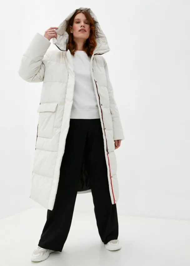 Тем, кто не любит объемную верхнюю одежду, советуем обратить внимание на этот прямого кроя белый пуховик с капюшоном. Подклад с синтетическим наполнителем делает его очень легким, но в то же время теплым. Его можно носить с широкими брюками, прямыми брюками или надевать поверх платьев и юбок длины миди или макси. Что касается обуви, то к пуховику подойдут и зимние кроссовки, и треккинговые ботинки, и лаконичные сапоги, и ботильоны на низком каблуке. Из аксессуаров добавляй базовую шапку бини и длинный шарф гладкой фактуры.