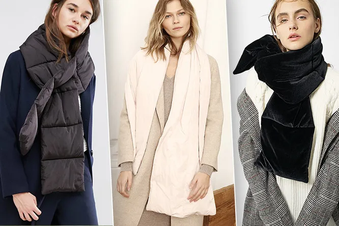 Мода на пуховики легитимизировала новые формы. Отныне и шарфы в моде пуховые, дутые. Выбираем модели на любой вкус и кошелек: нейлоновые и бархатные, с мелкой прострочкой и без.