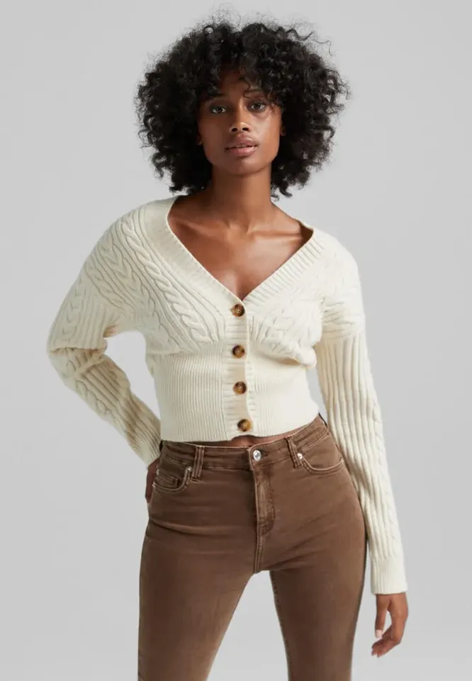 Этот кардиган можно носить как в моноварианте, так и сочетая его с бра-топом. Чтобы добавить образу чувственности, можешь оставить расстегнутыми несколько пуговиц, причем неважно, каких именно — верхних или нижних.