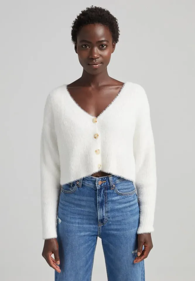 Ворсистая фактура делает этот кардиган мягким и уютным. Длина до пояса зрительно акцентирует талию. Носи эту модель в сочетании с брюками или юбками с высокой посадкой, чтобы придать силуэту форму и визуально удлинить ноги.