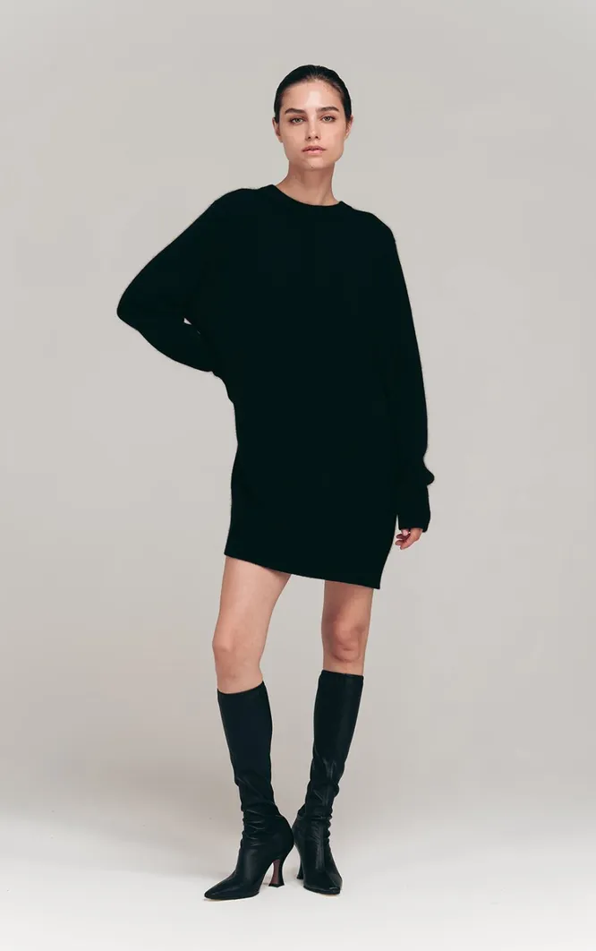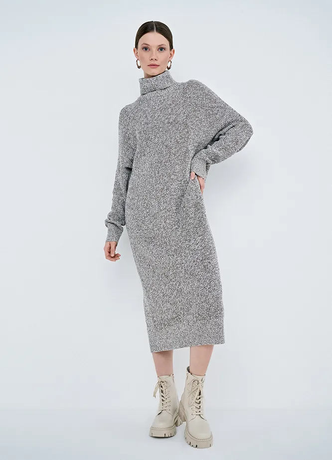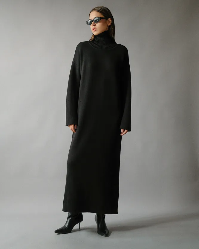 Чаще всего платья-свитеры шьют в базовых оттенках (черный, серый, белый, бежевый), но если ты выбираешь платье длины макси, то лучше отдать предпочтение черному или серому оттенкам: светлый подол осенью все время будет грязным. Но спорить не будем: молочные платья-свитеры в комбо с высокими сапогами того же оттенка — просто невероятное сочетание!