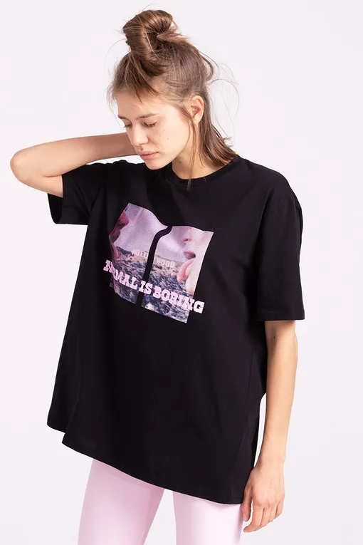 Черная футболка с ярким принтом – идеальный вариант для тех, кто носит total black. Такая модель хорошо сочетается как с лосинами, так и с джинсовой юбкой.