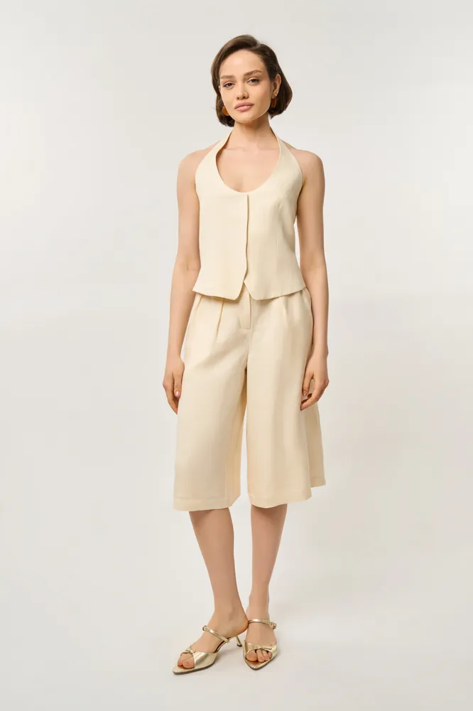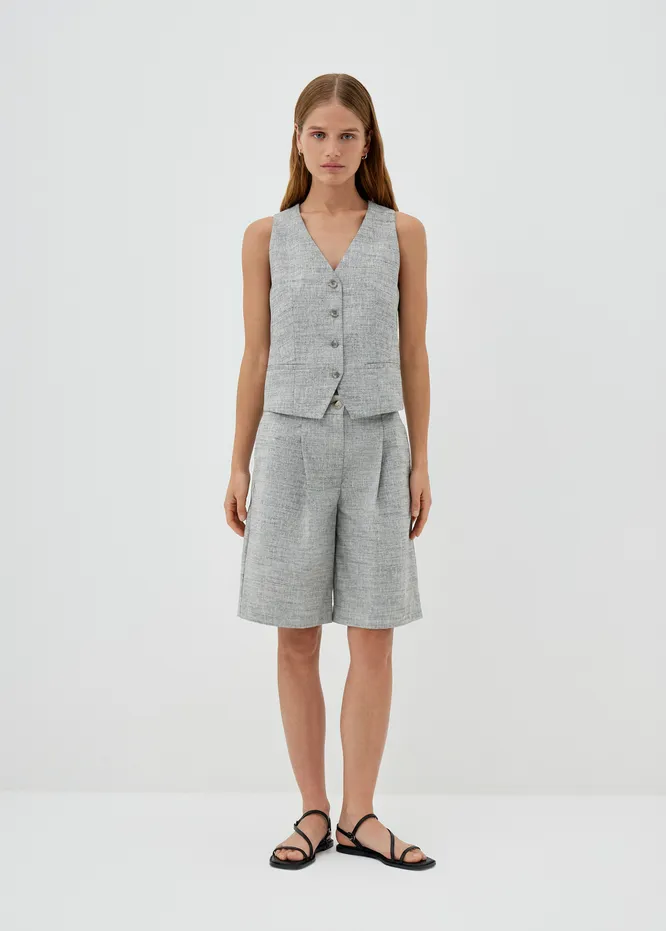 Да и вне рабочего пространства костюмные шорты не подведут: с базовой футболкой и, скажем, биркенштоками они выглядят вполне достойно и не совсем просто. А если заменишь топ на жилет в тон шортам, то получишь просто суперфотогеничный образ, который собирается за две секунды. Находка!