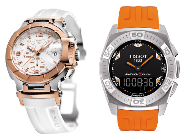 Другая модель — Tissot Racing-Touch (справа). В авангардный дизайн часов встроены 11 динамичных функций, которые легко освоит молодой и энергичный владелец этого хронометра (или симпатичная владелица). Высокие технологии сочетаются с современным дизайном, созданным при помощи привлекательных и прочных материалов. Главная фишка – сенсорный экран. Модель оснащена: всеми функциями хронографа; функцией бортового журнала, в который заносятся личные результаты и данные, индикацией времени в двух часовых поясах, двумя будильниками и подсветкой.