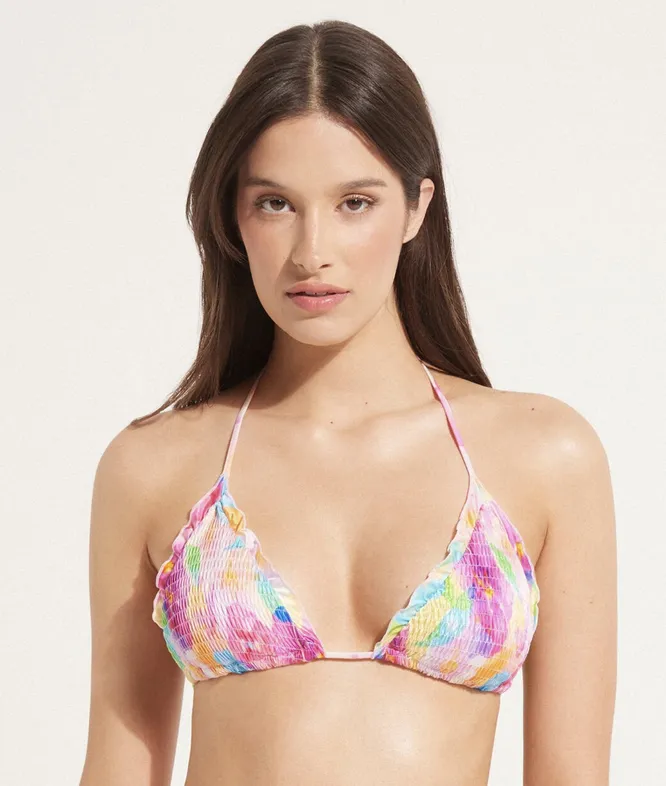 С «перевернутым треугольником» история та же, что и с «грушей», только наоборот! Тем, у кого плечи объемнее бедер, нужно подчеркивать как раз нижнюю часть тела. Здесь на помощь придут акцентные плавки: с рюшами, всевозможными завязки и оборками. А лифу в этом случае лучше быть скромнее: никаких лишних деталей и декоративных элементов.