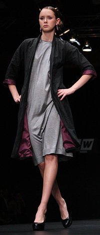 Цветовая гамма коллекции Бирюкова, как водится, неброская: серый, белый, сливочный, черный, коричневый, бежевый с очень умеренными и нечастыми акцентами – например, атласные манжеты цвета фуксии на черном блузоне, розовое платье-баллон или темно-бордовая подкладка темного летнего пальто.