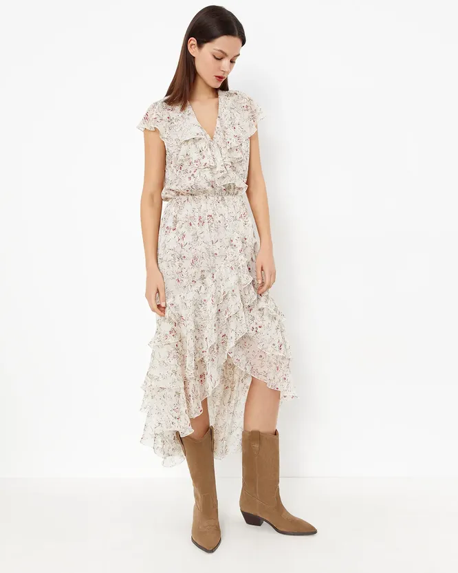 Да-да, это то самое цветочное миди, которое стало одной из самых узнаваемых фишек Брэдшоу. Асимметричный разрез на подоле, крупный растительный принт, мягкие воланы по линии декольте — идеальное ведь платье! Кстати, не без стройнящего бонуса: вырез на ноге делает тебя немного выше, а рюши на плечах маскируют верхнюю часть рук, которую многие девушки считают проблемной зоной.