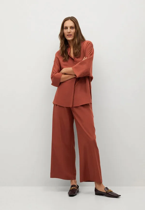 Элегантную блузу в пижамном стиле можно носить с широкими брюками или комбинировать с прямыми костюмнымии. Для более гармоничных аутфитов заправляй верх в брюки.