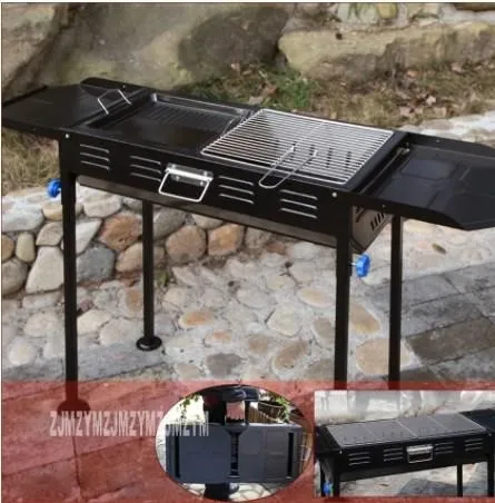 В готовом к работе виде гриль имеет такие параметры: высота — 96,3 см, а ширина 108 см. Специальный рычаг позволяет регулировать положение решеток внутри. Две плиты по бокам пригодятся для того, чтобы держать наготове сырые продукты или складывать готовые. Гриль прост в использовании и его легко транспортировать.