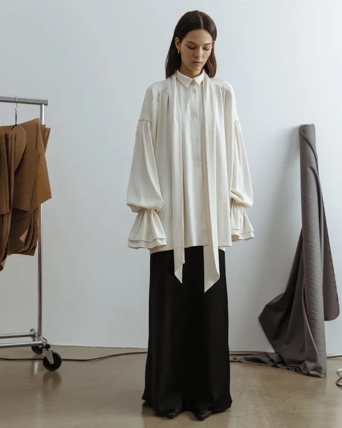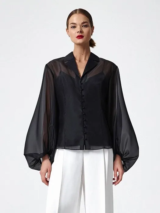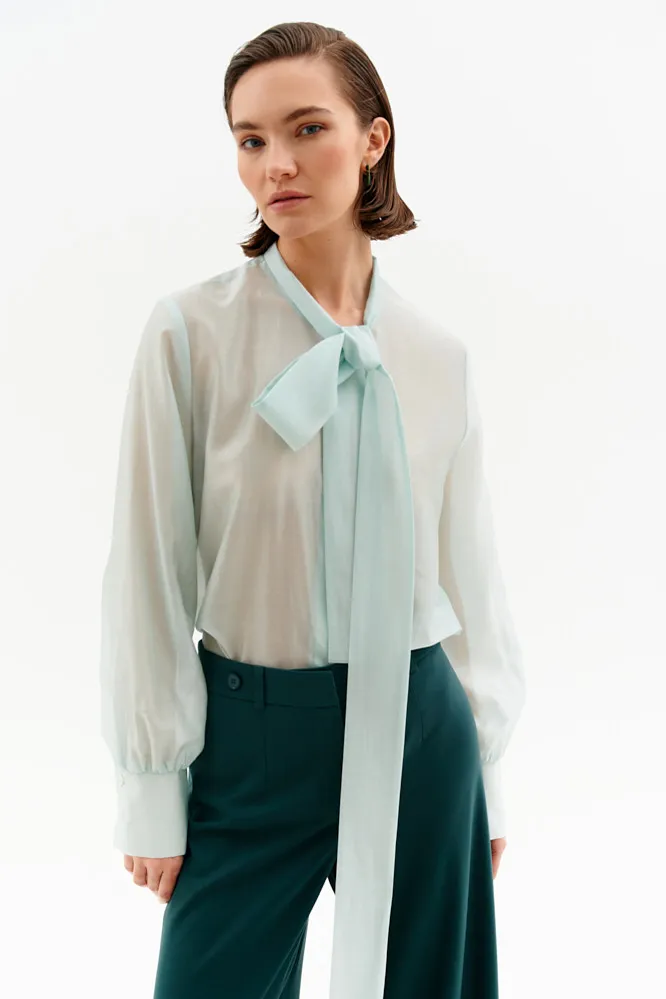 Банты преследуют нас уже не один сезон. Оно и понятно: блуза с таким элементом просто обязана сделать любой образ эффектным. Обрати внимание на прозрачную модель с объемными рукавами и внушительным бантом. К такой блузе подойдут классические брюки или юбка. Идеальный аутфит на все случаи готов!