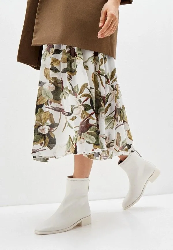 Натуральные кожаные сапоги белого цвета лучше комбинировать с яркими и принтованными вещами. Светлые демисезонные сапоги помогут тебе сбалансировать образ и грамотно его завершить.