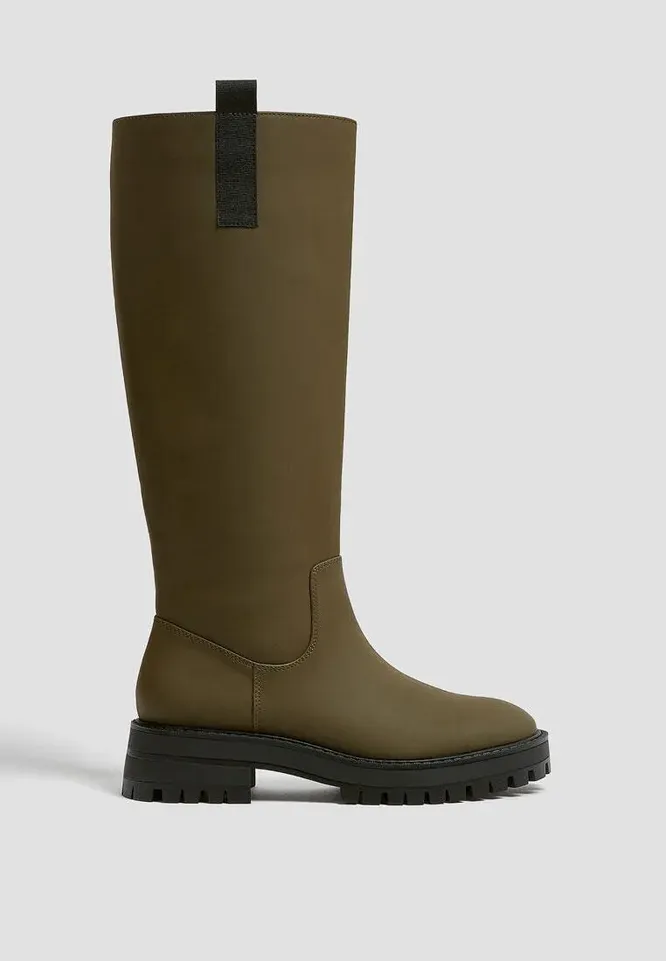Мы привыкли к серым, коричневым и черным сапогам. Пришло время внести разнообразие в свой фэшен-режим — добавляй в базовый гардероб высокие грубые сапоги цвета хаки. Кстати, носить их можно не только с джинсами или джоггерами. Ботфорты удачно смотрятся и расклешенными юбками.
