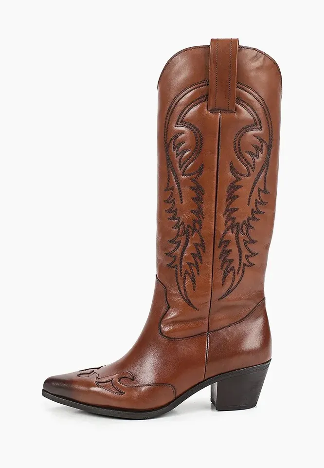 Коричневые демисезонные сапоги в стиле вестерн — идеальное дополнение к любым повседневным образам. Обувь сделана из натуральной кожи и дополнена аккуратной этнической вышивкой.