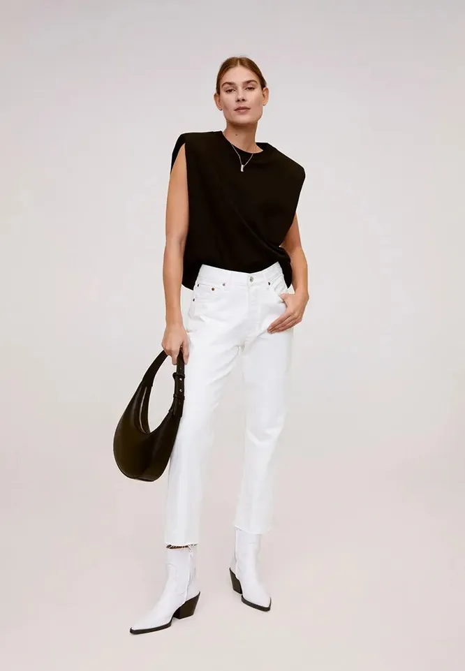 Белые джинсы идеально подходят для офиса. Чтобы сделать образ более официальным, сочетай их с классическим черным блейзером и строгой обувью в тон. Не перегружай композицию аксессуарами — минимум декора и никаких лишних деталей. Расставить акценты помогут пара сережек-пусетов, лаконичный пояс, стильная цепь или наручные часы с тонким ремешком.
