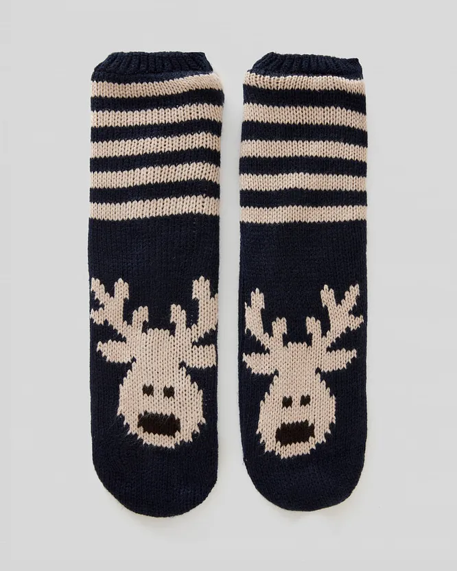 Второй вариант – шерстяные носки одного размера со схематичным изображением одного из главных атрибутов Нового года – оленей. Их вполне можно носить не только дома в тандеме с новогодней пижамой, но и с повседневными аутфитами. Особенно интересно они хороши со строгими брюками или брючными костюмами и лоферами.