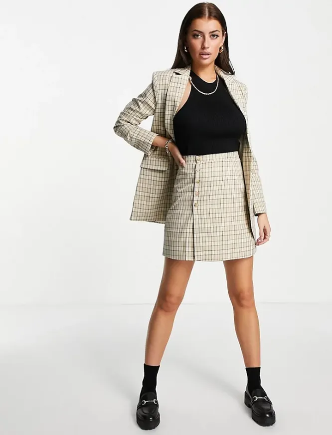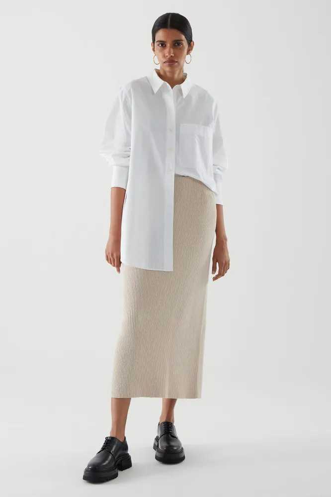 Для расслабленных минималистичных луков выбирай бежевую трикотажную юбку в рубчик. Сочетай ее с оверсайз-рубашками и сандалиями, лодочками и удлиненным блейзером.