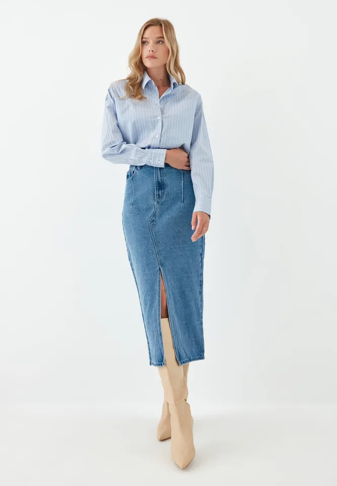Джинсовая юбка миди с разрезом стильно смотрится с оверсайз-рубашками и яркими лодочками. Если хочешь получить более расслабленный лук, сочетай ее с высокими кедами и объемным свитшотом.