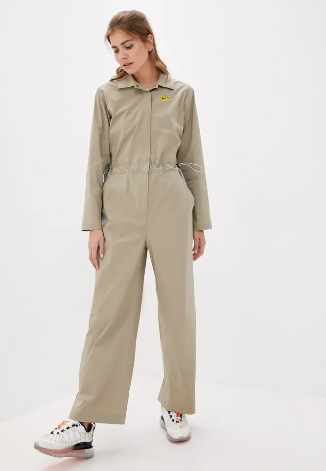 Если ты черпаешь вдохновение из винтажных фотобуков, скорее всего, тебе придется по душе бежевый комбинезон в рабочем стиле. Вещь дополнена свушем и брендовыми надписями. Носить рекомендуем с объемными кроссовками или грубыми ботинками.