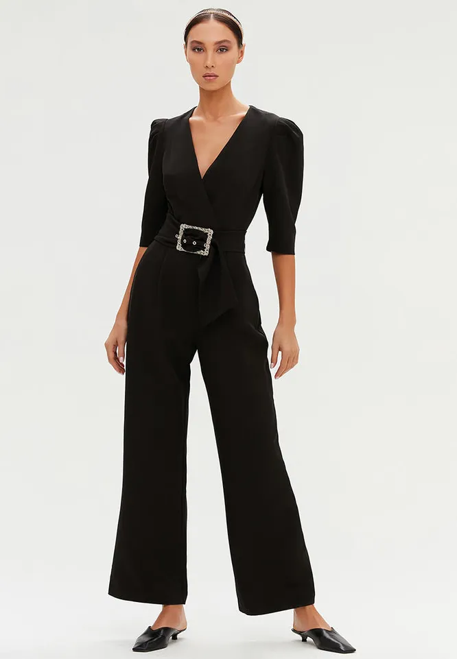 Черный вечерний комбинезон с расклешенным низом и объемным верхом эффектно подчеркнет достоинства фигуры и выделит линию талии.