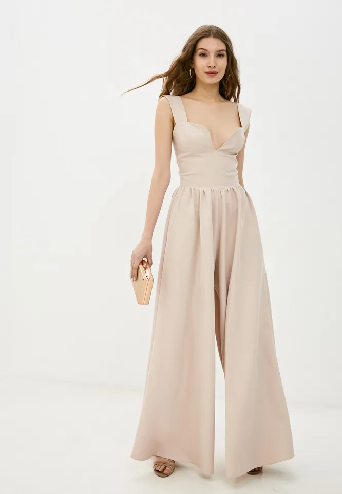 Изящный бежевый комбинезон с брюками клеш и винтажным лифом. Такая модель отлично сидит на девушках с фигурой «песочные часы» и «груша».