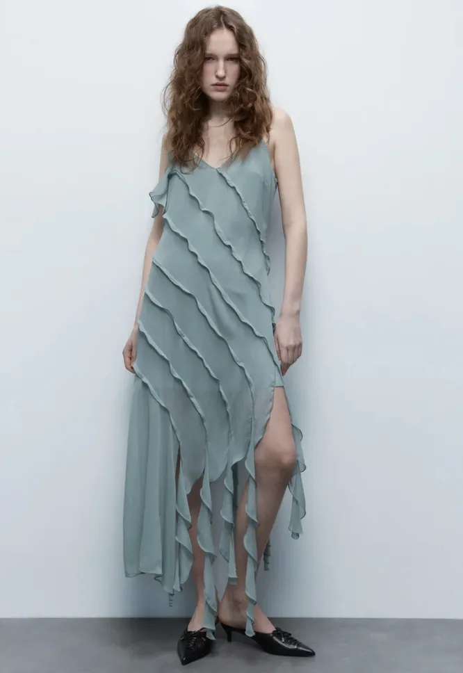 Платье с воланами — вот уж точно романтика в чистом виде. К тому же, тренд, ведь рюши всех форм и размеров в этом сезоне сводят инфлюэнсеров с ума. Но перед тем как безвозвратно влюбиться, помни: при всей своей воздушности воланы визуально делают фигуру шире. Так что если ты наоборот хочешь скрыть объем в некоторых местах, то выбирай более прямые и аккуратные силуэты.
