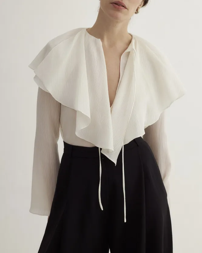 Сразу же вспомнили сказку о седьмом лепестке и песню о нем же «А дождь на окнах рисует». Белая блуза и белая рубашка обязаны быть в твоем гардеробе, и, чтобы не повторяться в моделях, мы всегда приглядываемся к нестандартным, слегка винтажным дизайнам. Эта находка с воздушными воланами — именно то, что спасает и самую скучную юбку-карандаш, и простые джинсы.