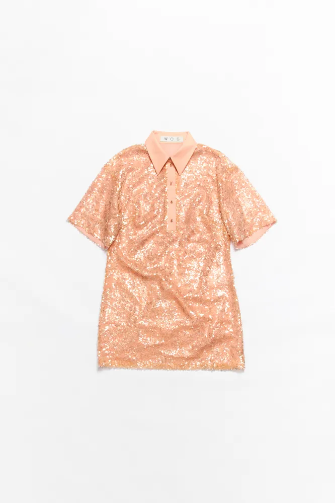 А мимо платьев-трансформеров вообще не можем пройти мимо. В WOS появилась класная персиковая новинка, полностью расшитая пайетками: выглядит она как рубашка-поло, а на самом деле является полноценным мини-платьем. Его можно носить и без поддержки с белыми кроссовками, и с поясом (если рост позволяет), и в босоножками. Вариаций много, эффект один — вау!